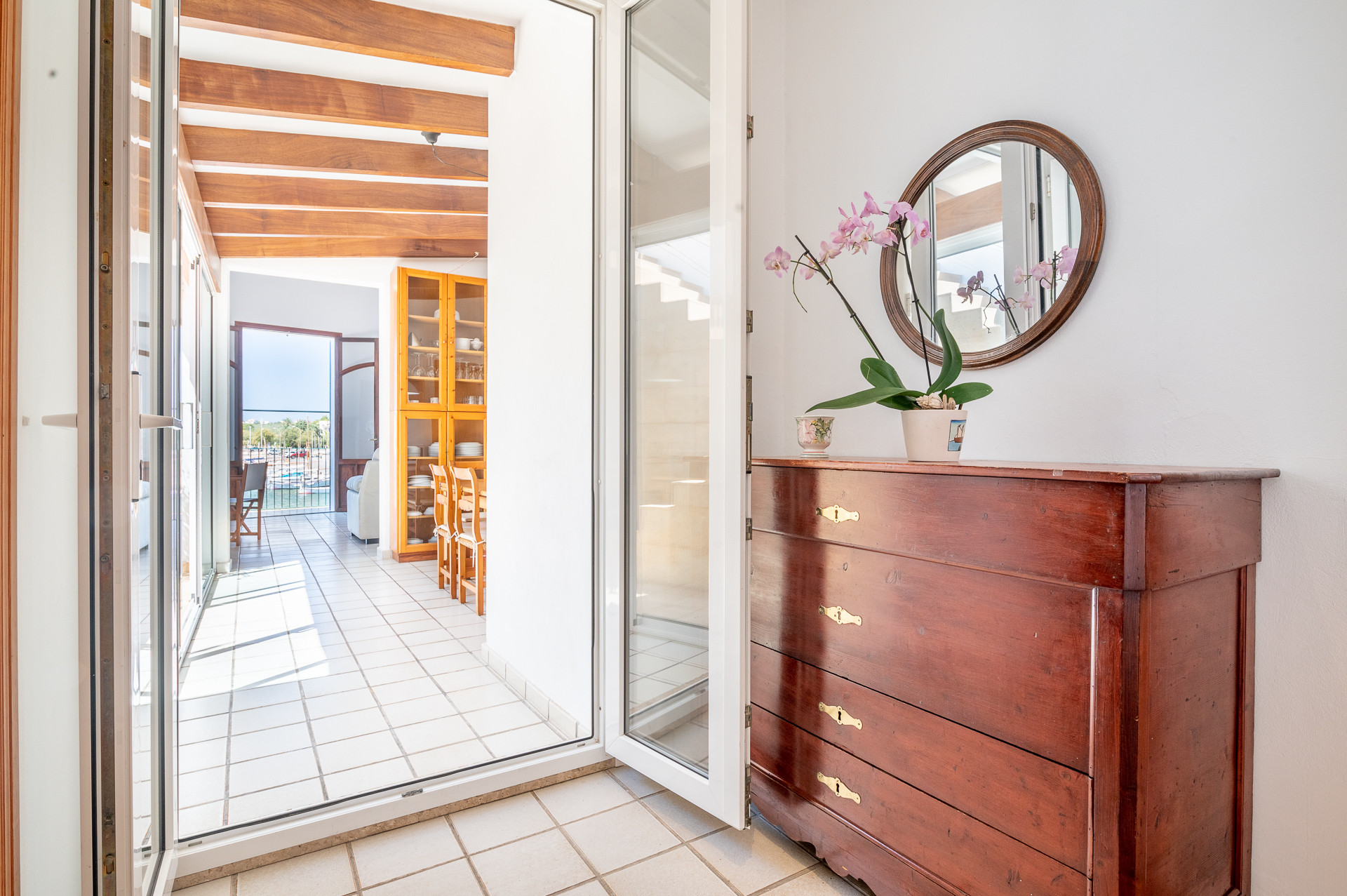 Das Wohn-Esszimmer ist weitläufig und mit einer grosszügig ausgestatteten Küche versehen; die Ess Zone bietet ein 5 Personen Tisch und der Wohnraum zwei Sofas mit offenem Kamin, Fernseher und Balkon mit unglaublichem Blick auf den Hafen von Portocolom.