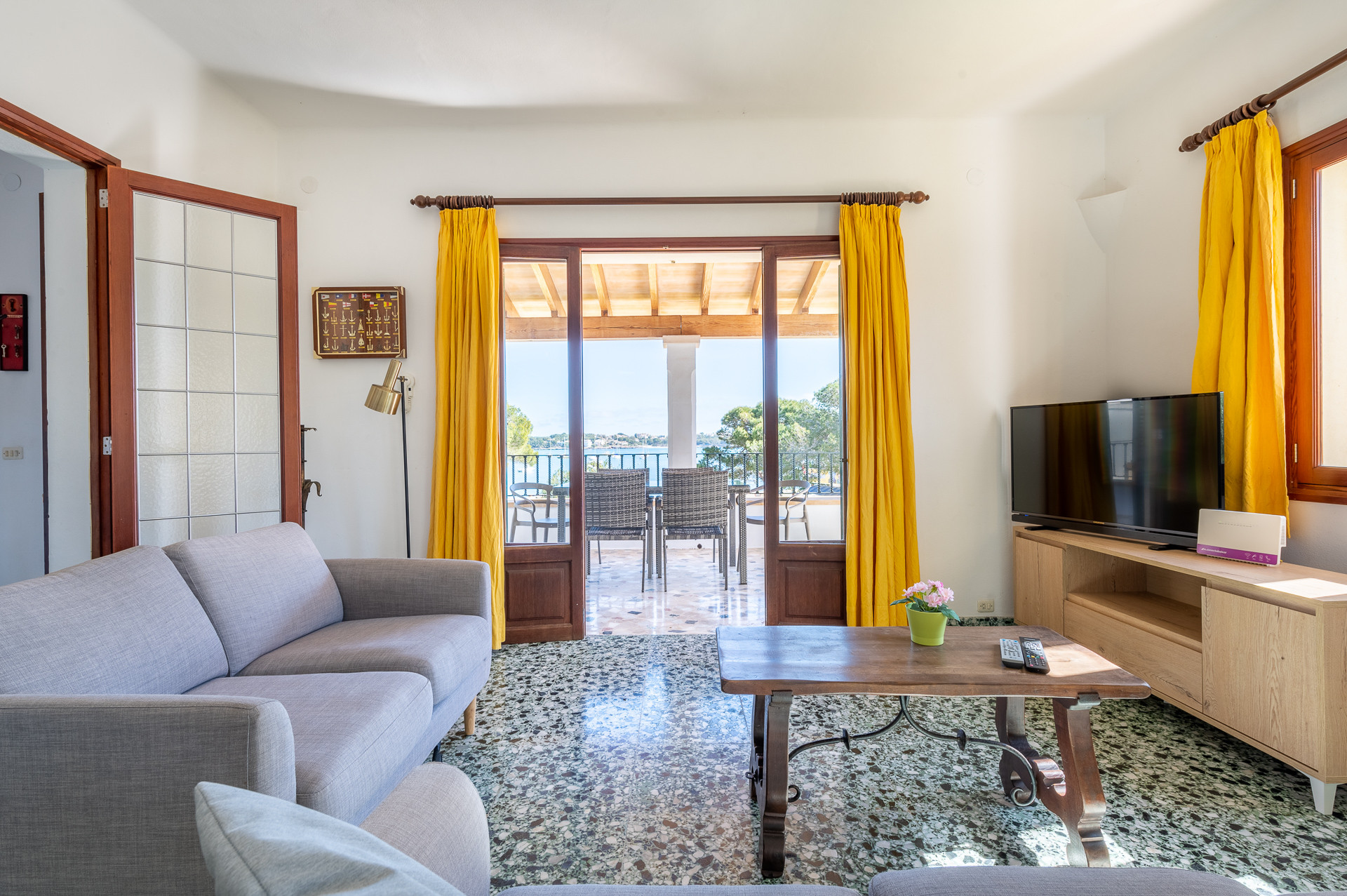 Diese zweistöckige Villa befindet sich in einer sehr ruhigen Gegend von Portocolom. Es gibt keine eigenen Parkplätze für die Bewohner, aber ausreichend Parkmöglichkeiten vor dem Haus. Ein mit Bambusstäben neben der Haupttür geschmückter Eingang führt zum Wohn-/ Esszimmer, in dem sich auch die Treppe in die zweite Etage befindet. Im Wohnzimmer gibt es ein großes Sofa, einen Esstisch und einen Fernseher; neben dem Wohnraum befindet sich die mit Herd, Backofen, Mikrowelle, Kaffeemaschine, Toaster und allem erforderlichen Geschirr voll ausgestattete Küche.